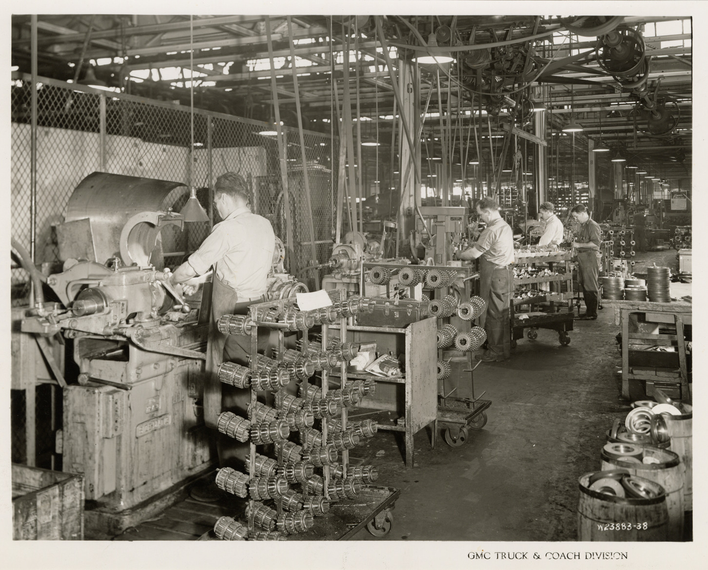 Favorite this☆ Workers on finish grinding line, Plant 1, GMC Truck & Coach Division factory Description: View of workers on the finish grinding line, Plant 1, GMC Truck & Coach plant. Printed on front: "GMC Truck & Coach Division." Handwritten on back: "Plant 1. Machine shop & Heat Treat Dept. Dept. 4, finish grinding line, machine shop, Bldg. 12. Factories--GMC, ca. 1943." Details Resource ID: na050462 Subject: Automobile industry workers--Michigan--Pontiac Grinding machines--Michigan--Pontiac Automobile factories--Michigan--Pontiac GMC Truck & Coach Assembly-line methods Photographic prints Date Issued: 1943 (year approximate) Format: 1 photographic print ; 7.75 x 10 in. Member of: National Automotive History Collection Filing Location: Factories--GMC, ca. 1943, #10 Rights: Physical rights are retained by DPL. Copyright is retained in accordance with U.S. copyright laws.