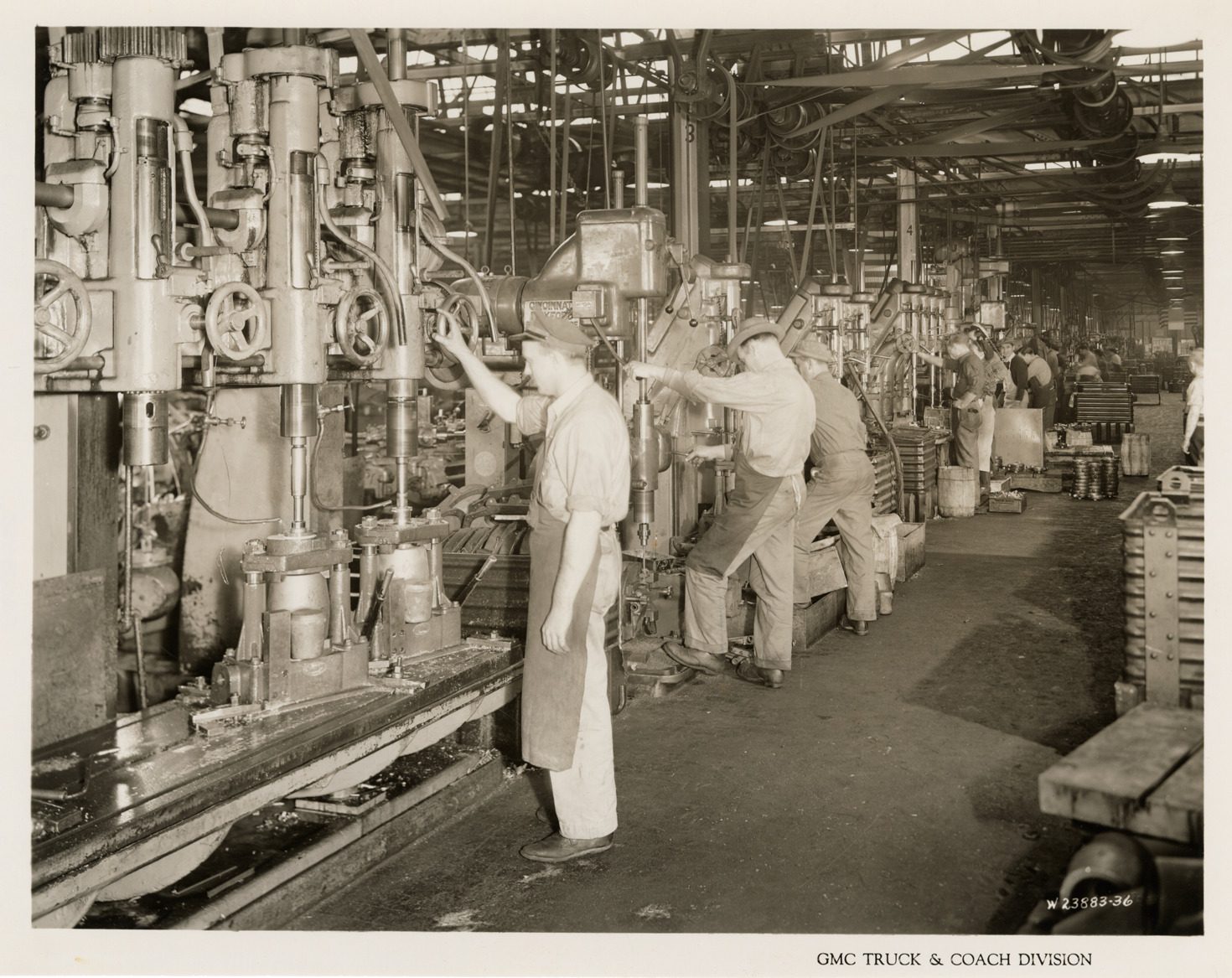 Favorite this☆ Workers operating machinery, Plant 1, GMC Truck & Coach Division factory Description: View of workers operating machinery at Plant 1, GMC Truck & Coach plant. Printed on front: "GMC Truck & Coach Division." Handwritten on back: "Plant 1. Machine shop & Heat Treat Dept. Dept. 4, machining operations on tire inflation. DUKW parts and 7-70 parts, machine shop, Bldg. 12. Factories--GMC, ca. 1943." Details Resource ID: na050465 Subject: Automobile industry workers--Michigan--Pontiac Machinery--Michigan--Pontiac Automobile factories--Michigan--Pontiac GMC Truck & Coach Photographic prints Date Issued: 1943 (year approximate) Format: 1 photographic print ; 8 x 10 in. Member of: National Automotive History Collection Filing Location: Factories--GMC, ca. 1943, #10 Rights: Physical rights are retained by DPL. Copyright is retained in accordance with U.S. copyright laws.