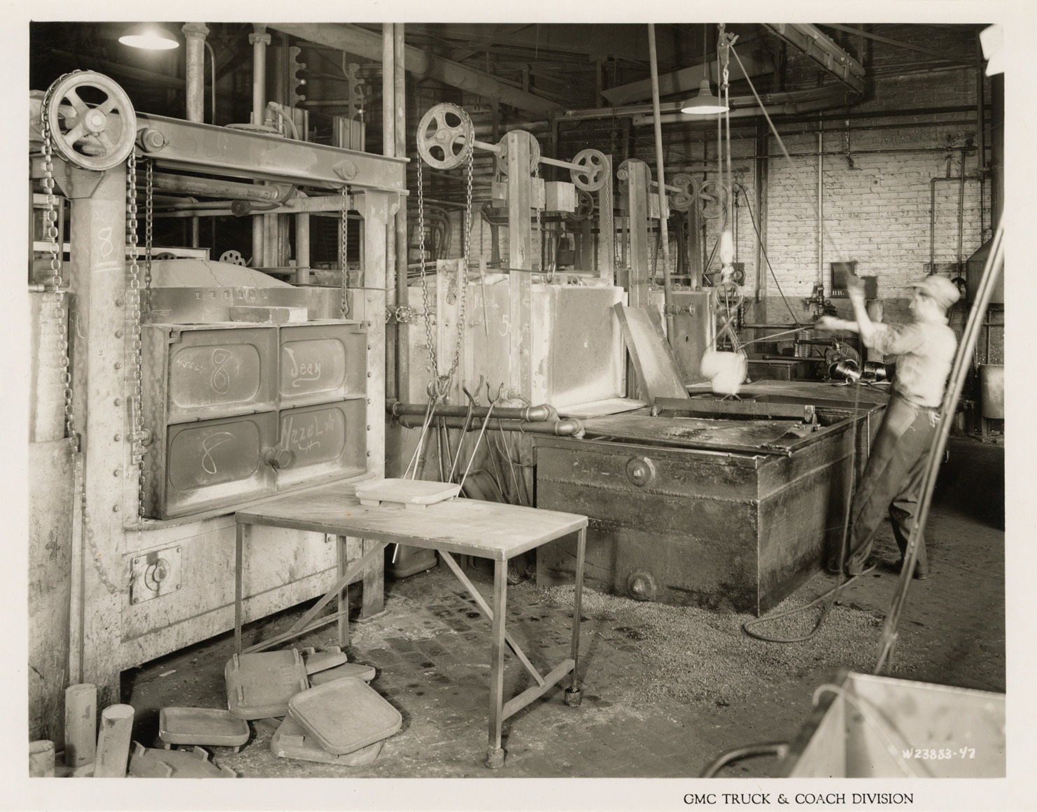 Favorite this☆ Worker in Heat Treat Department, Plant 1, GMC Truck & Coach Division factory Description: View of a worker in the Heat Treat Dept. at Plant 1, GMC Truck & Coach plant. Printed on front: "GMC Truck & Coach Division." Handwritten on back: "Plant 1. Machine shop & Heat Treat Dept. Dept. 3, Heat Treat Dept., furnaces, Bldg. 12. Factories--GMC, ca. 1943." Details Resource ID: na050471 Subject: Automobile industry workers--Michigan--Pontiac Metals--Heat treatment--Michigan--Pontiac Metallurgical furnaces Automobile factories--Michigan--Pontiac GMC Truck & Coach Photographic prints Date Issued: 1943 (year approximate) Format: 1 photographic print ; 8 x 10 in. Member of: National Automotive History Collection Filing Location: Factories--GMC, ca. 1943, #11 Rights: Physical rights are retained by DPL. Copyright is retained in accordance with U.S. copyright laws.
