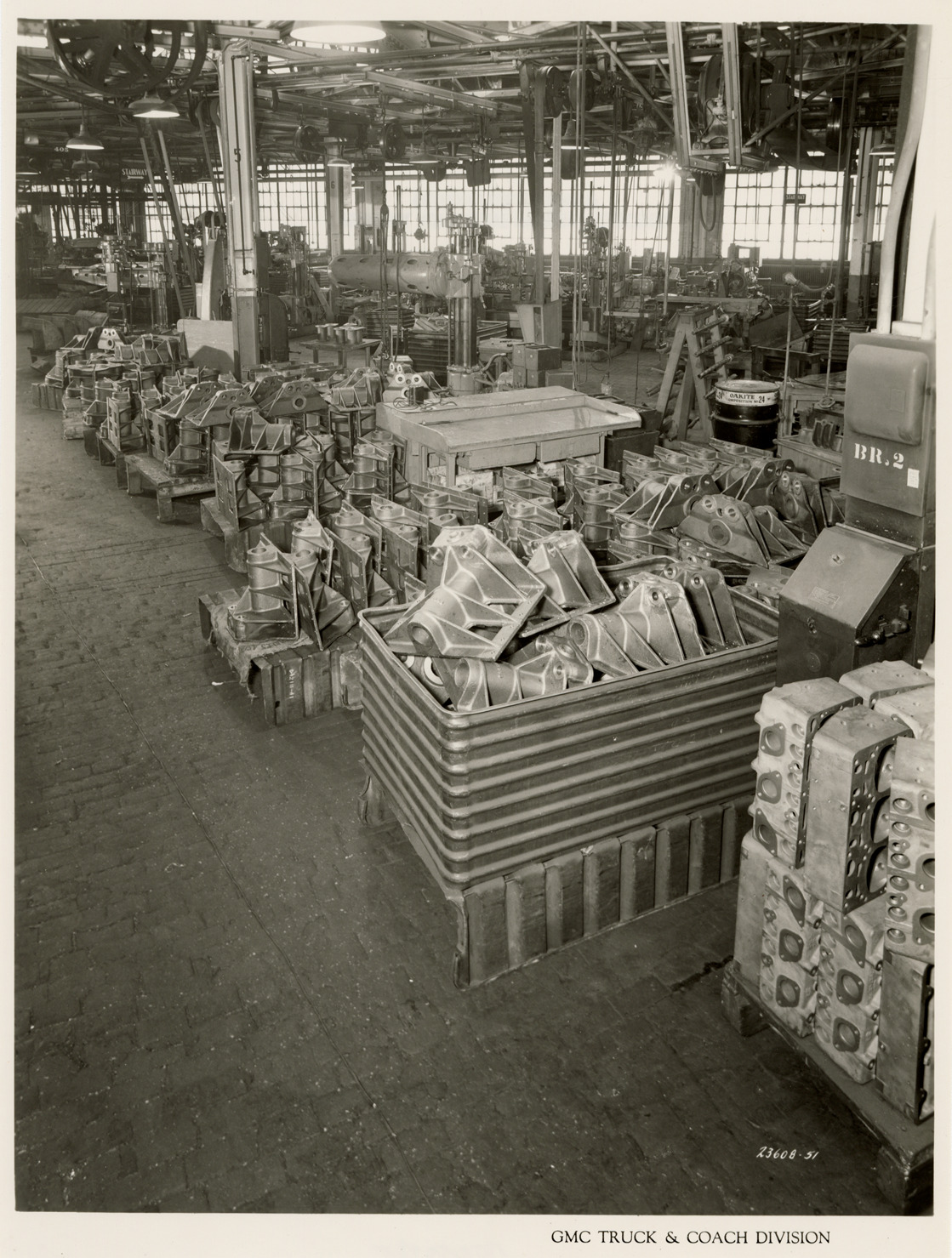 View of trunnion brackets in bins in machine shop at Plant 1, GMC Truck & Coach plant. Printed on front: "GMC Truck & Coach Division." Handwritten on back: "Plant 1. Machine shop, Depts. 2 & 4, Bldg. 12. Dept. 4, trunnion bracket machining, south end of line looking north. Factories--GMC, ca. 1943."