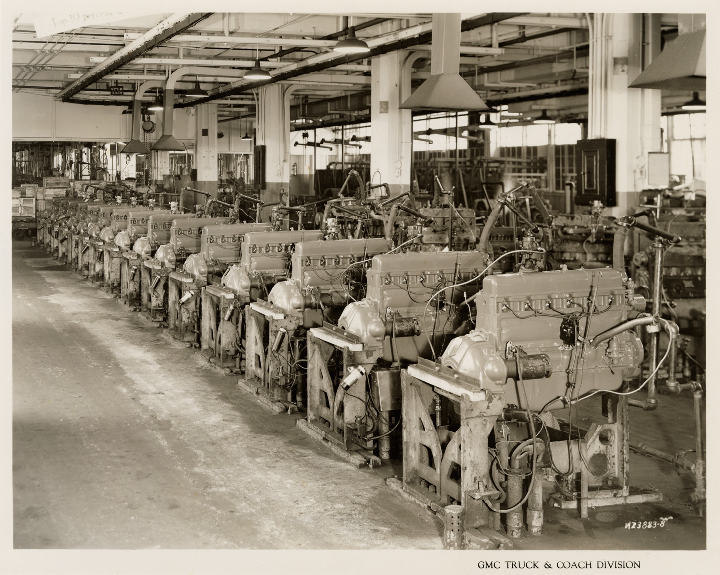View of dynamometer test stands in Engine Assembly Area at Plant 1, GMC Truck & Coach plant. Printed on front: "GMC Truck & Coach Division." Handwritten on back: "Plant 1. 1st floor Engine Assembly Area, Bldg. 5. Dynamometer test stands, Dept. 8, looking north. Factories--GMC, ca. 1943."