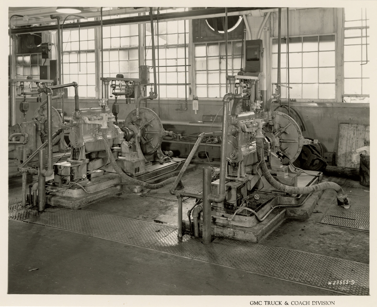 View of dynamometer test stands in Engine Assembly Area at Plant 1, GMC Truck & Coach plant. Printed on front: "GMC Truck & Coach Division." Handwritten on back: "Plant 1. 1st floor Engine Assembly Area, Bldg. 5. Dynamometer test stands as used for Plant 1 engines, Dept. 8. Factories--GMC, ca. 1943."