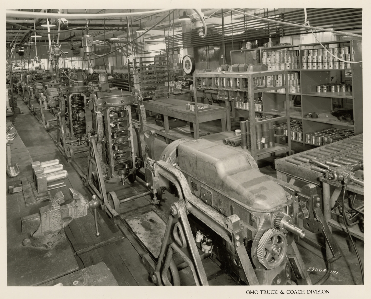 Favorite this☆ Engine assembly line, Plant 1, GMC Truck & Coach Division factory Description: View of the engine assembly line in Engine Assembly Area at Plant 1, GMC Truck & Coach plant. Printed on front: "GMC Truck & Coach Division." Handwritten on back: "Plant 1. 1st floor Engine Assembly Area, Bldg. 5. Engine assembly line, Dept. 5. Factories--GMC, ca. 1943." Details Resource ID: na050508 Subject: Motor vehicles--Motors--Design and construction Automobile factories--Michigan--Pontiac GMC Truck & Coach Assembly-line methods Photographic prints Date Issued: 1943 (year approximate) Format: 1 photographic print ; 8 x 10 in. Member of: National Automotive History Collection Filing Location: Factories--GMC, ca. 1943, #12 Rights: Physical rights are retained by DPL. Copyright is retained in accordance with U.S. copyright laws.