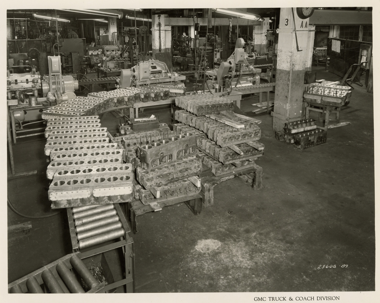 View of the cylinder block inspection line in Buick machine shop at Plant 1, GMC Truck & Coach plant. Printed on front: "GMC Truck & Coach Division." Handwritten on back: "Plant 1, Dept. 6. Buick machine shop. In basement of Bldg. 4. Cylinder block inspection line. Factories--GMC, ca. 1943."