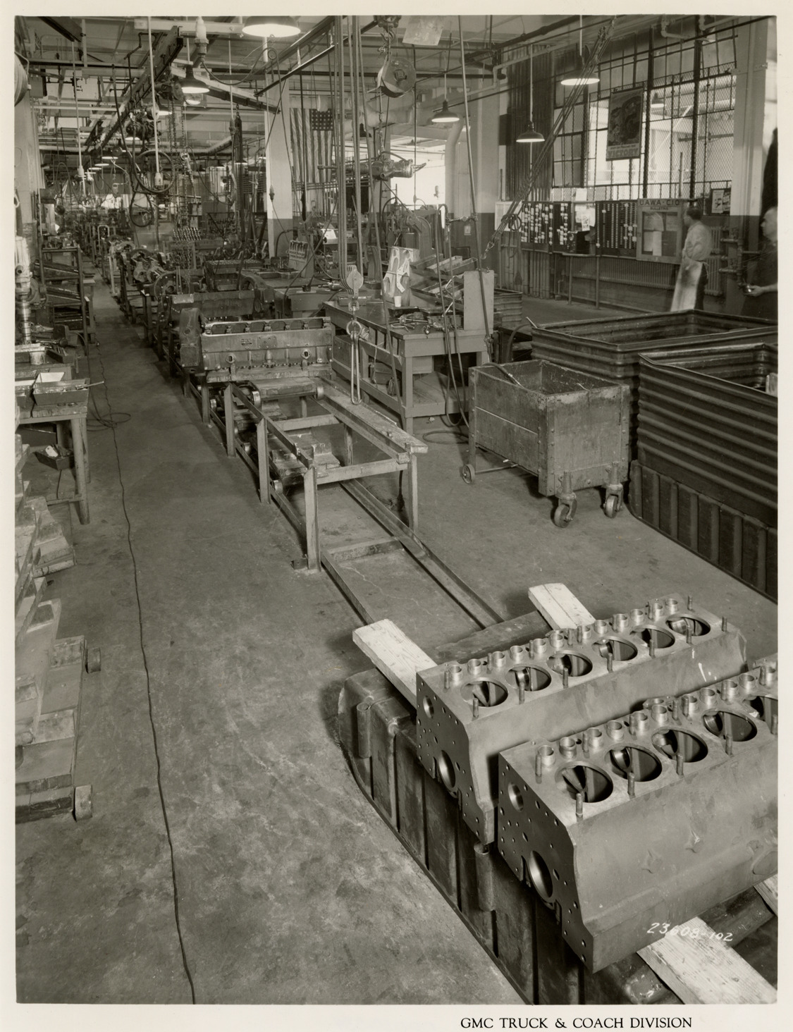 View of the engine block assembly line in Buick machine shop at Plant 1, GMC Truck & Coach plant. Printed on front: "GMC Truck & Coach Division." Handwritten on back: "Plant 1, Dept. 6. Buick machine shop. In basement of Bldg. 4. Block assembly line. Factories--GMC, ca. 1943."