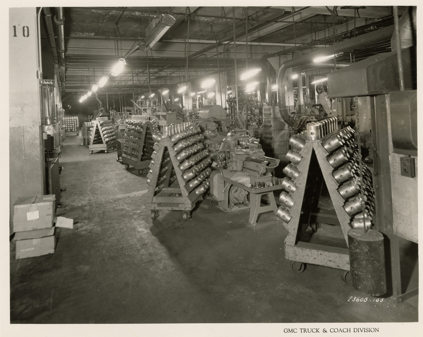 View of the piston machining line in Buick machine shop at Plant 1, GMC Truck & Coach plant. Printed on front: "GMC Truck & Coach Division." Handwritten on back: "Plant 1, Dept. 6. Buick machine shop. In basement of Bldg. 4. Piston machining line. Factories--GMC, ca. 1943."
