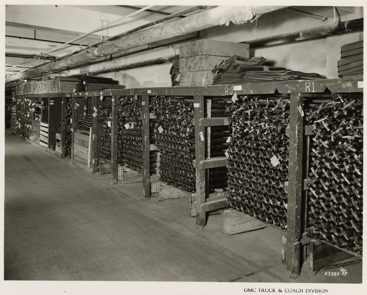 View of basement storage for Service Division at Plant 1, GMC Truck & Coach plant. Printed on front: "GMC Truck & Coach Division." Handwritten on back: "Plant 1, Service Division stores & shipping. Basement storage of service parts, heavy racked material along wall, Bldg. #5. Factories--GMC, ca. 1943."