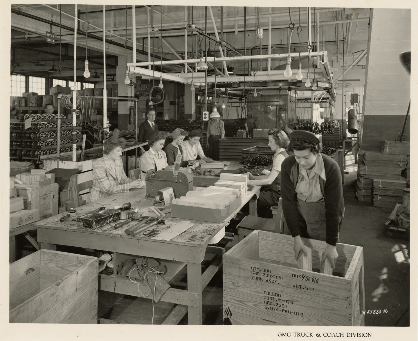 View of women workers at processing and packaging table at Plant 1, GMC Truck & Coach plant. Printed on front: "GMC Truck & Coach Division." Handwritten on back: "Plant 1, Military Service Parts Processing by Production, Bldg. 5, 2nd fl., Dept. 211. Processing & packaging table. Factories--GMC, ca. 1943."