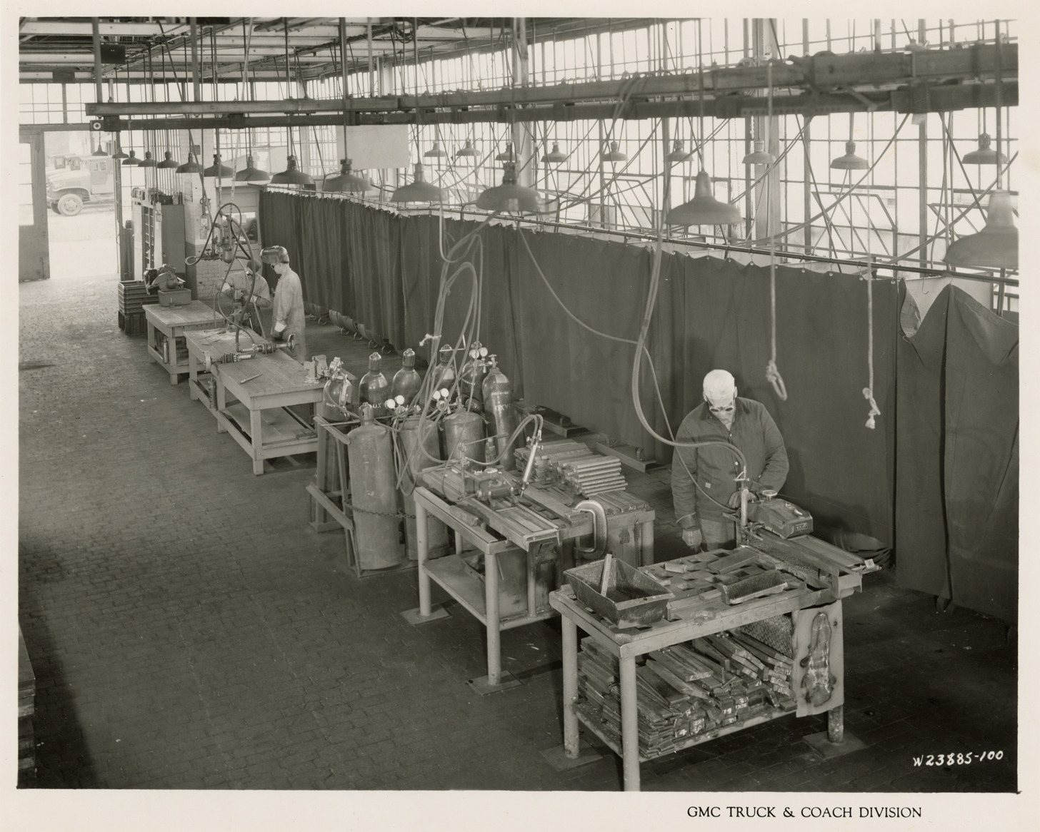 Favorite this☆ Workers in welding school, Plant 2, GMC Truck & Coach Division factory Description: View of workers in welding class at Plant 2, GMC Truck & Coach plant. Printed on front: "GMC Truck & Coach Division." Handwritten on back: "Plant 2, employment training schools for war work. Welding school, Bldg. 12. Factories--GMC, ca. 1943." Details Resource ID: na050575 Subject: Welders (Persons)--Michigan--Pontiac Automobile industry workers--Michigan--Pontiac Employee training facilities--Michigan--Pontiac Automobile factories--Michigan--Pontiac GMC Truck & Coach Photographic prints Date Issued: 1943 (year approximate) Format: 1 photographic print ; 8 x 9.75 in. Member of: National Automotive History Collection Filing Location: Factories--GMC, ca. 1943, #16 Rights: Physical rights are retained by DPL. Copyright is retained in accordance with U.S. copyright laws.