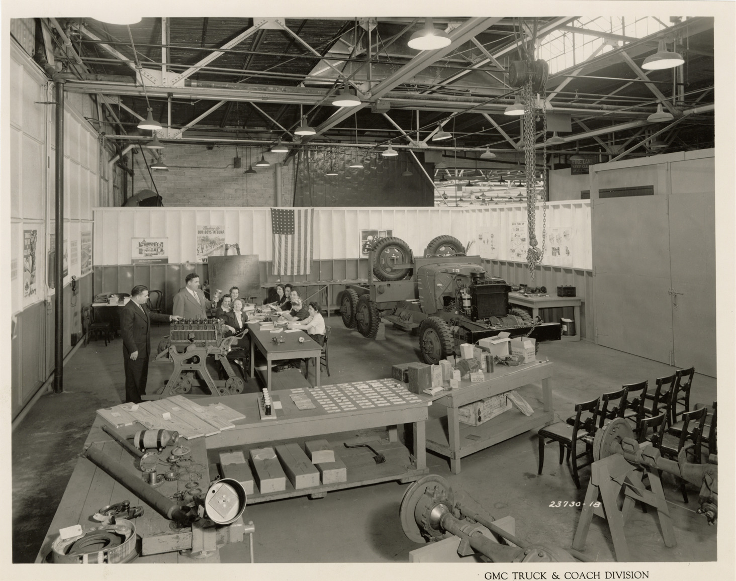View of women factory trainees in ordnance inspection class at Plant 2, GMC Truck & Coach plant. Printed on front: "GMC Truck & Coach Division." Handwritten on back: "Plant 2, employment training schools for war work. Ordnance inspection training. Factories--GMC, ca. 1943."