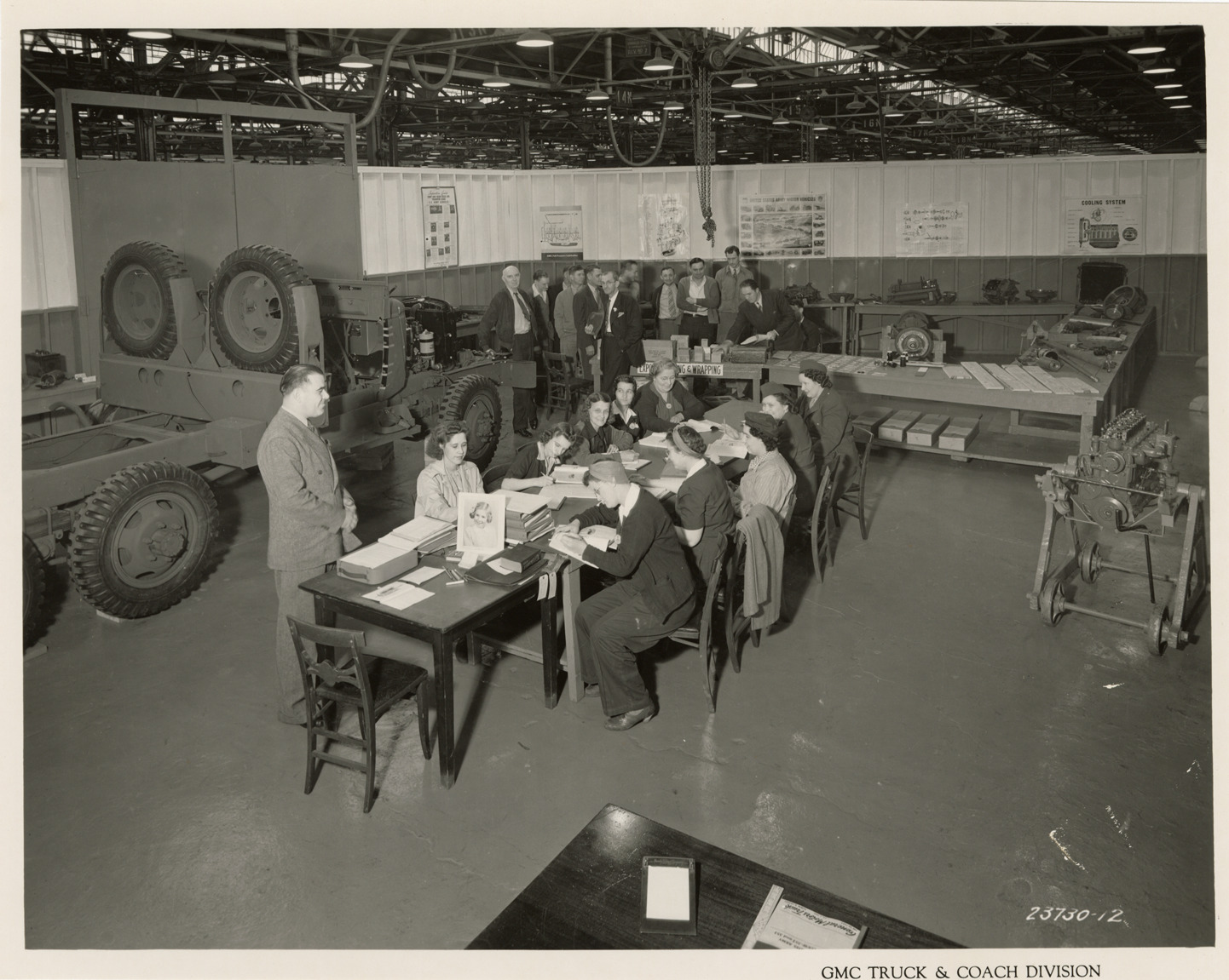 View of women factory trainees in ordnance inspection class at Plant 2, GMC Truck & Coach plant. Printed on front: "GMC Truck & Coach Division." Handwritten on back: "Plant 2, employment training schools for war work. Ordnance inspection training. Factories--GMC, ca. 1943."