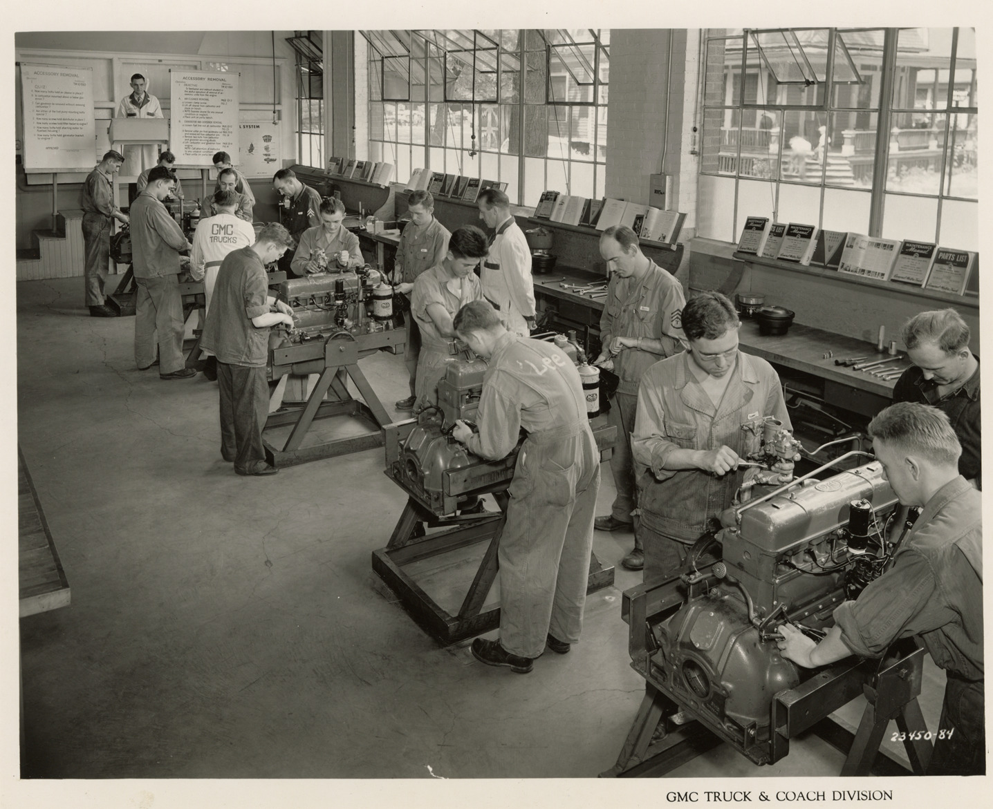 Factory trainees working on engines, Plant 4, GMC Truck & Coach Division factory