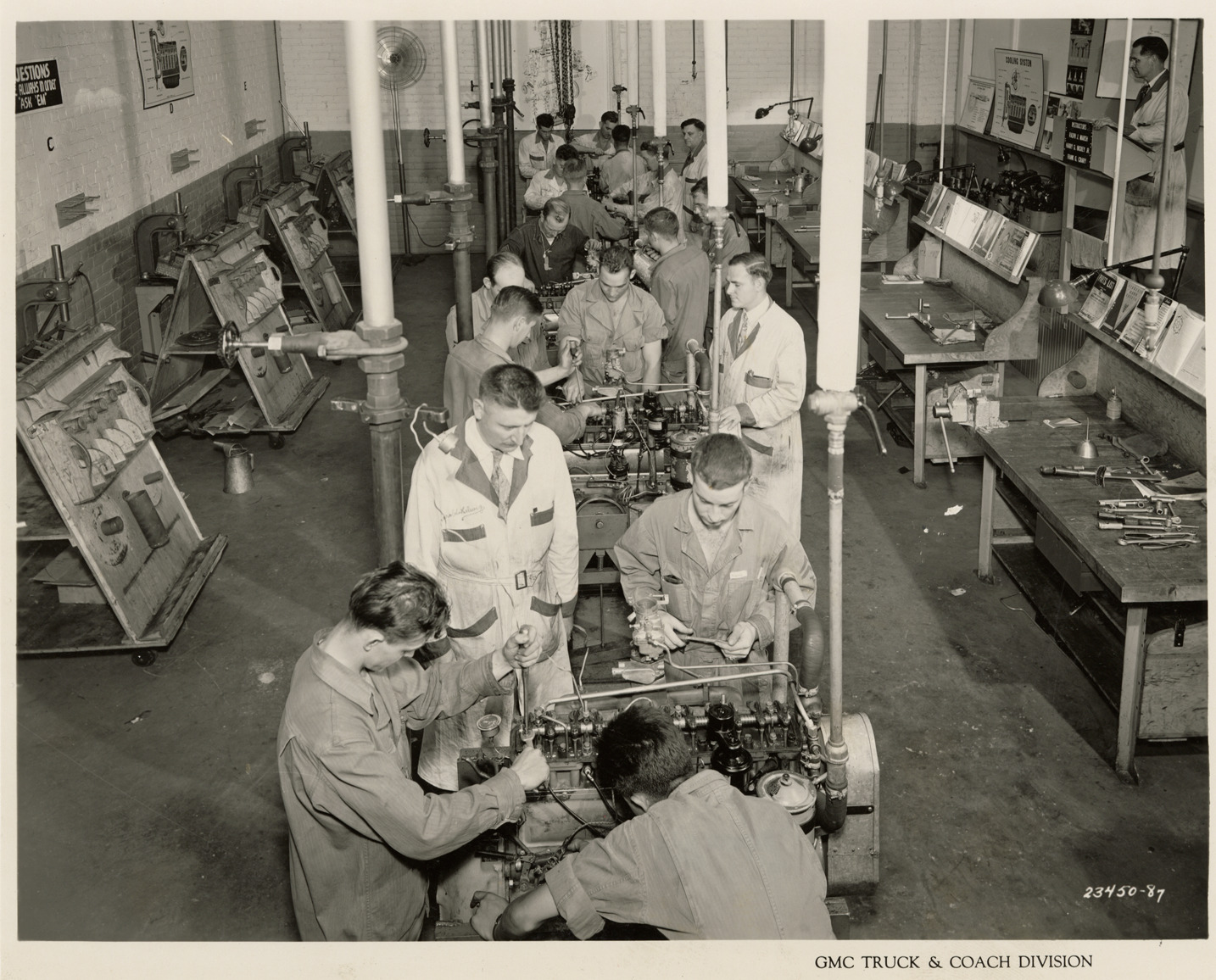 Factory trainees working on engines, Plant 4, GMC Truck & Coach Division factory