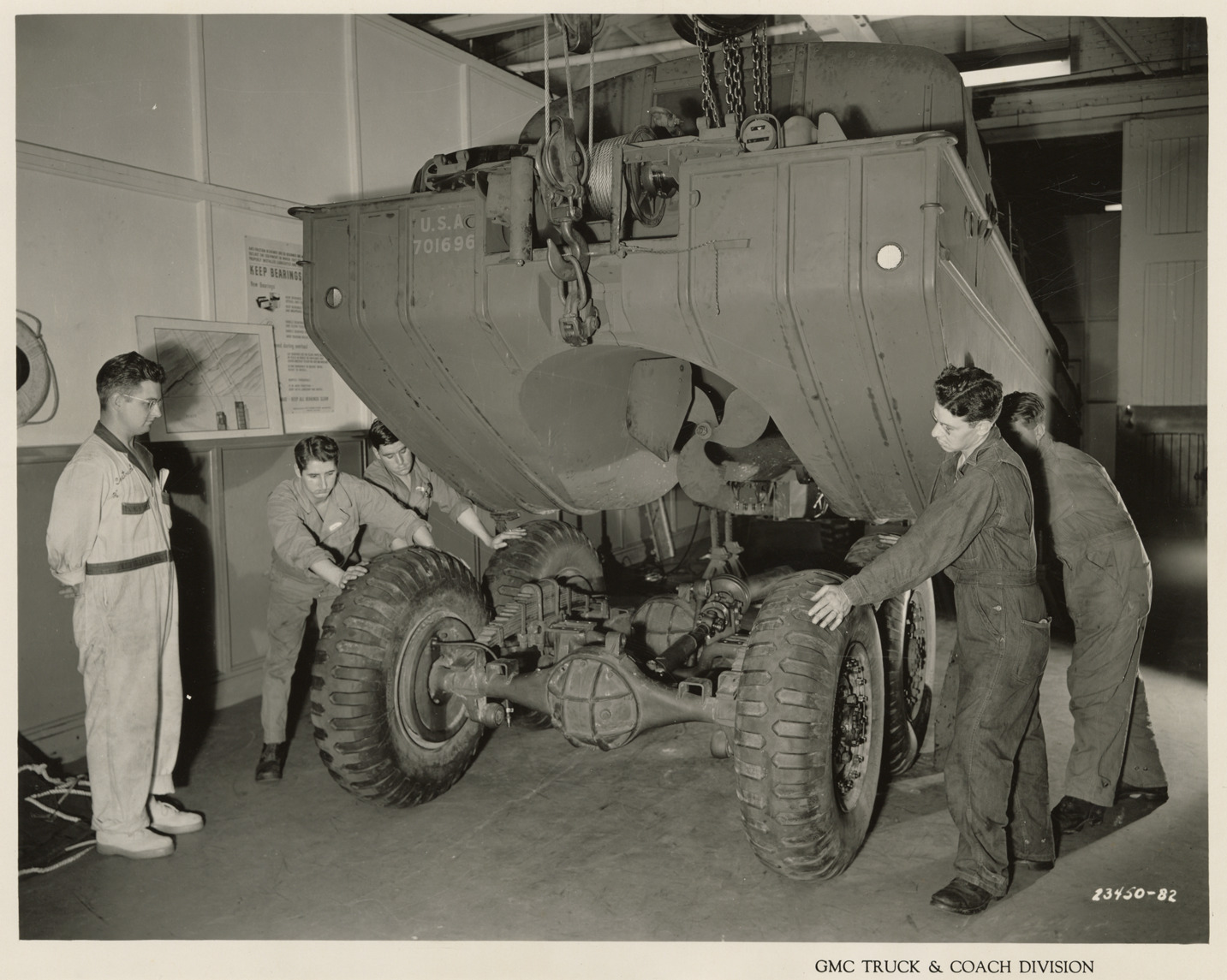 View of factory trainees servicing a DUKW at Plant 4, GMC Truck & Coach plant. Printed on front: "GMC Truck & Coach Division." Handwritten on back: "Plant 4, Service Technical School on amphibian truck (DUKW). Located in Detroit zone quarters. Factories--GMC, ca. 1943."
