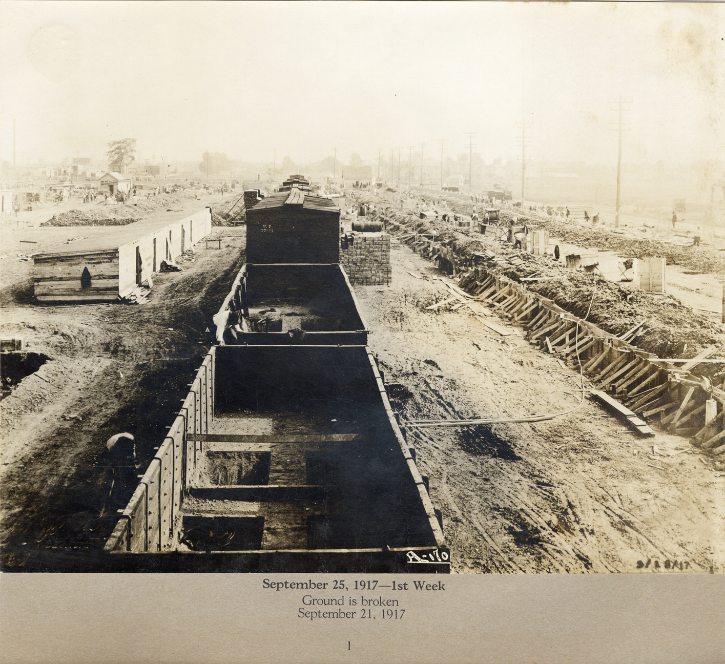 View of excavation for the Lincoln Motor Company factory during construction. Printed on front: "9/25/17." Printed on mat: "September 25, 1917, 1st week. Ground is broken, September 21, 1917. 1."