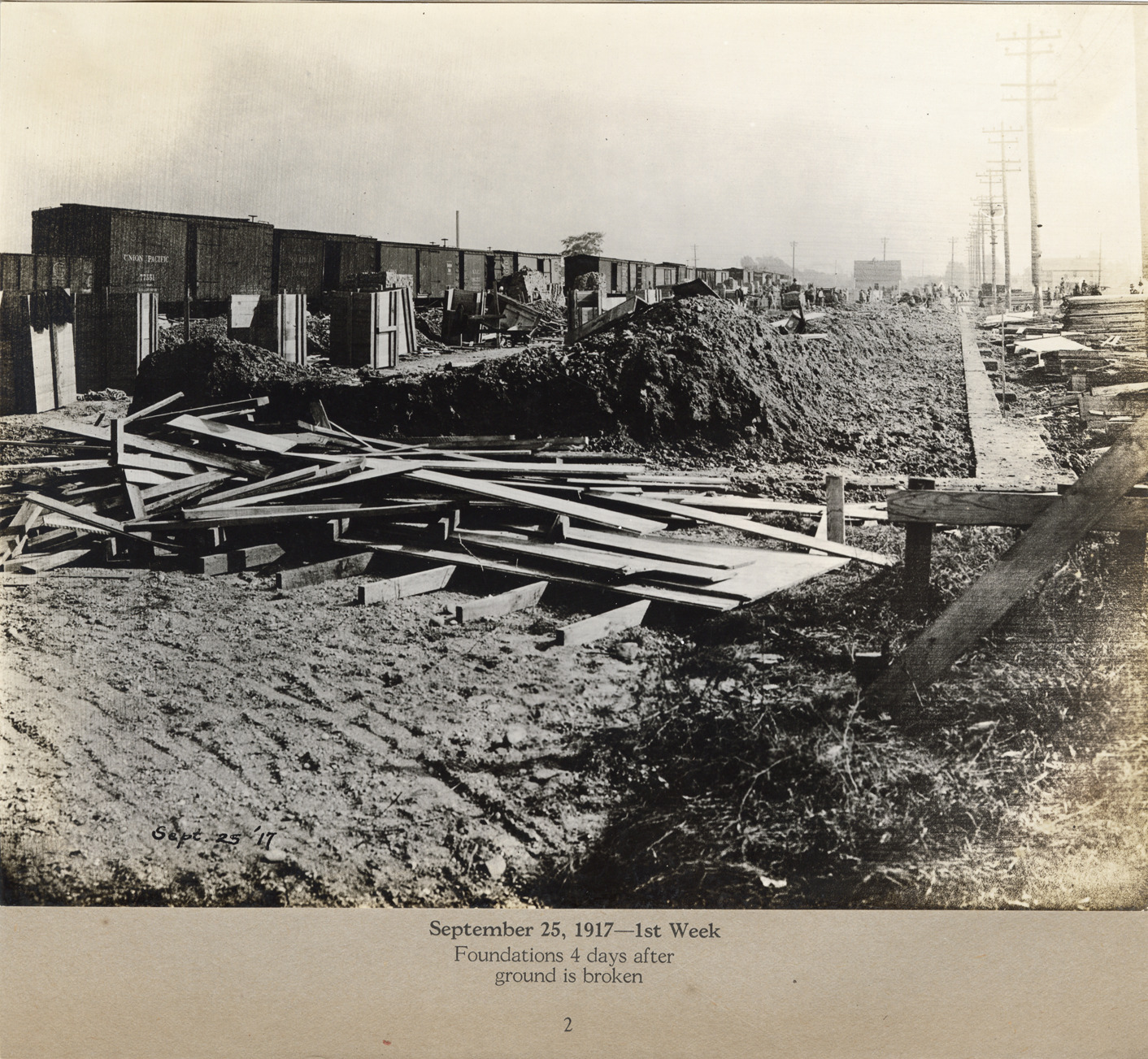 View of foundation construction for the Lincoln Motor Company factory. Printed on mat: "September 25, 1917, 1st week. Foundations 4 days after ground is broken. 2."