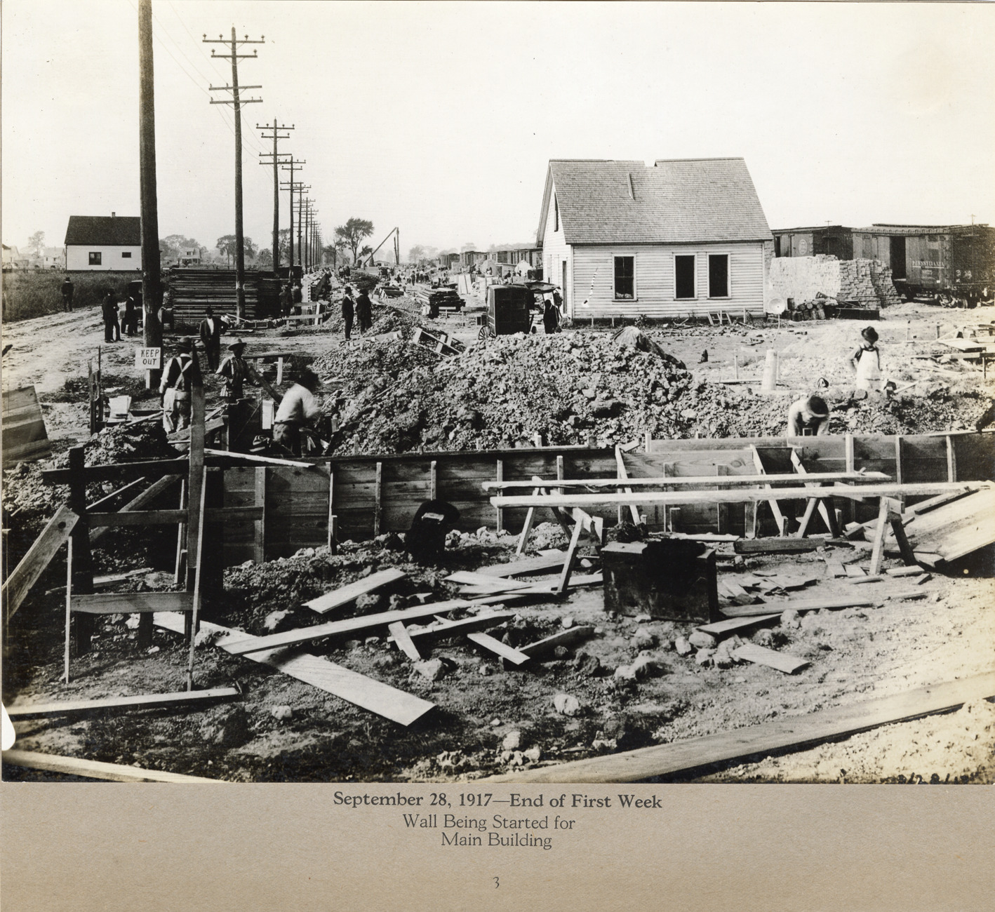 View of workers constructing wall for main building of the Lincoln Motor Company factory. Wooden-frame building and railroad freight cars in background. Printed on mat: "September 28, 1917, end of first week. Wall being started for main building. 3."