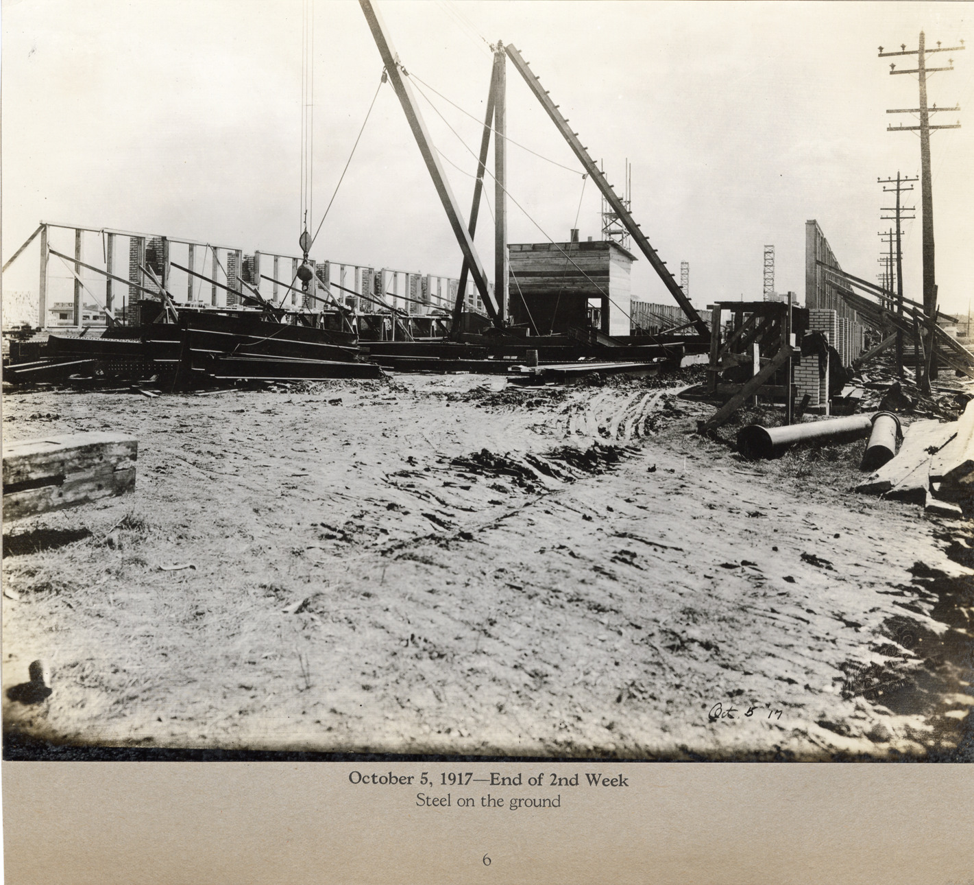 View of steel for structural framework on construction site of the Lincoln Motor Company factory. Printed on front: "Oct. 5 '17." Printed on mat: "October 5, 1917, end of 2nd week. Steel on the ground. 6."