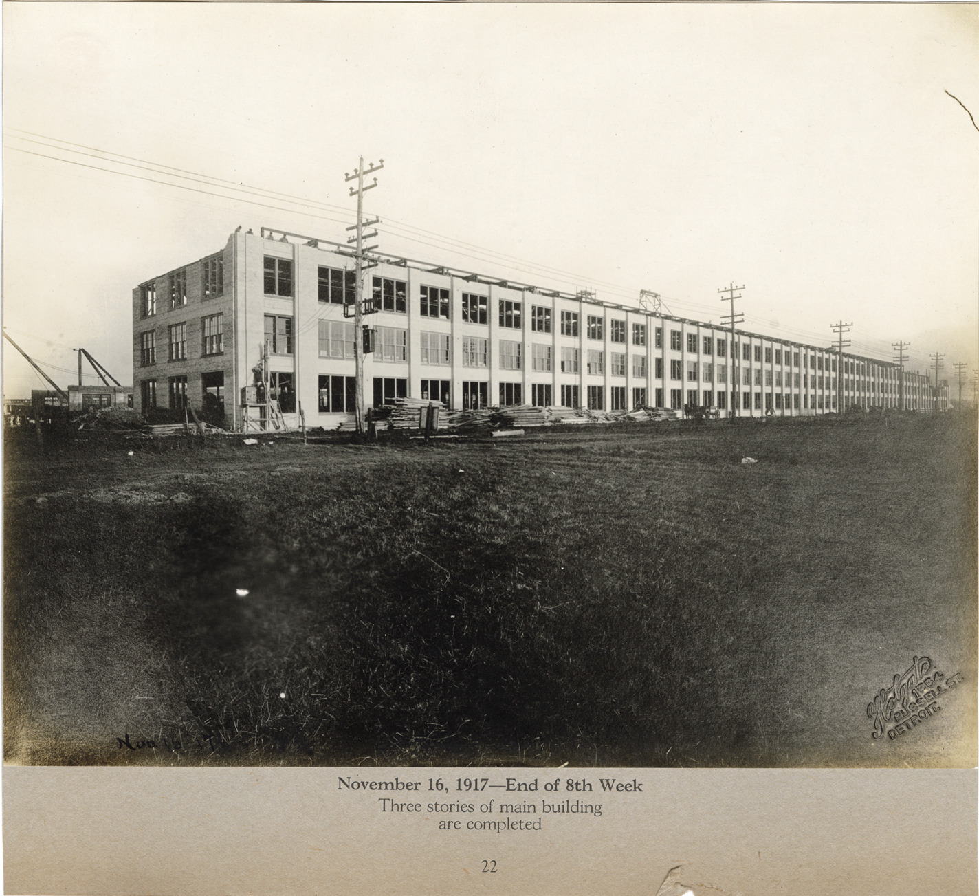 View of the main building during construction, Lincoln Motor Company factory. Printed on front: "Nov. 16 '17. Holgate, 1554 Russell St., Detroit." Printed on mat: "November 16, 1917, end of 8th week. Three stories of main building are completed. 22."