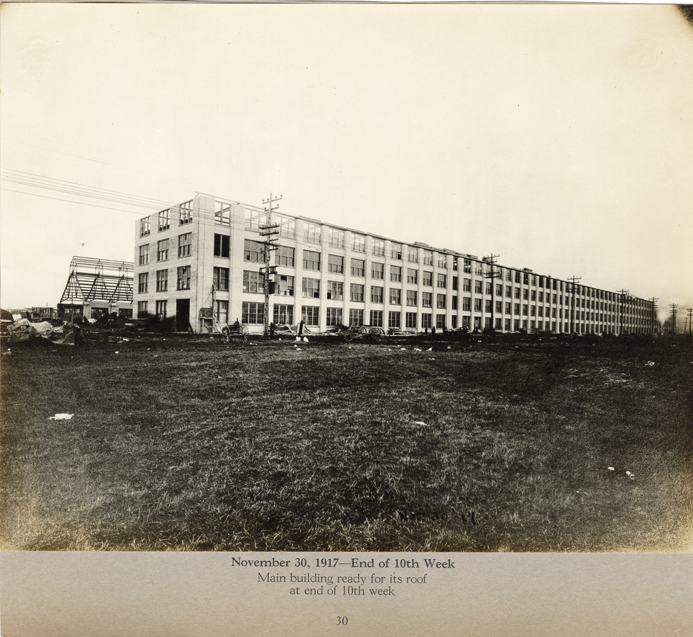 View of the main building during construction, Lincoln Motor Company factory. Printed on mat: "November 30, 1917, end of 10th week. Main building ready for its roof at end of 10th week. 30."
