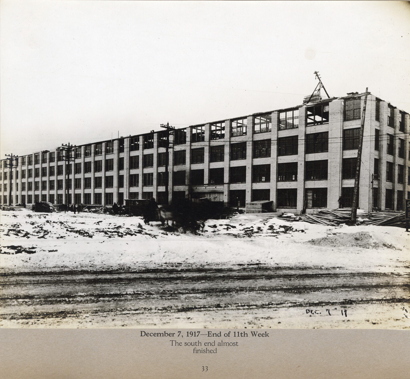 View of the main building during construction, Lincoln Motor Company factory. Printed on front: "Dec. 7 '17. Holgate, 1554 Russell St., Detroit." Printed on mat: "December 7, 1917, end of 11th week. The south end almost finished. 33."