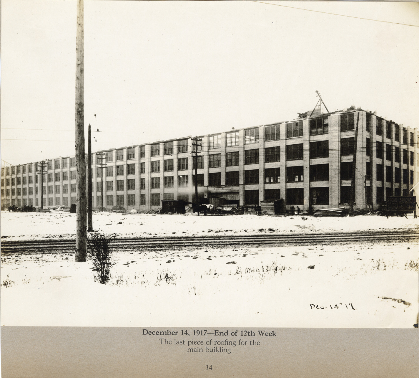 View of the main building during construction, Lincoln Motor Company factory. Printed on front: "Dec. 14 '17." Printed on mat: "December 14, 1917, end of 12th week. The last piece of roofing for the main building. 34."
