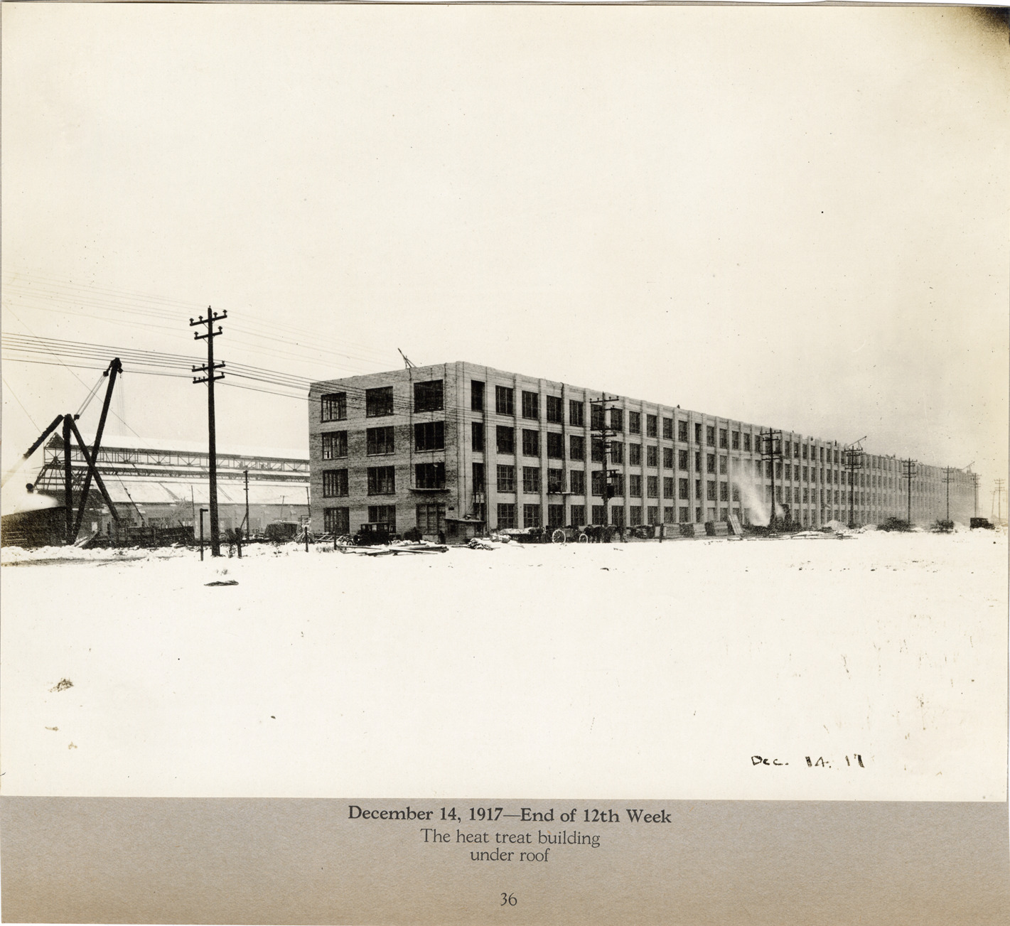 View of the heat treat building and main building during construction, Lincoln Motor Company factory. Printed on front: "Dec. 14 '17." Printed on mat: "December 14, 1917, end of 12th week. The heat treat building under roof. 36."