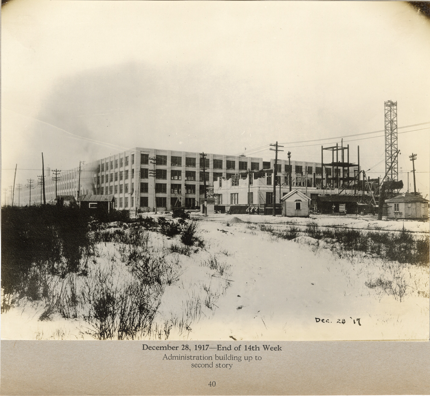 View of the administration building during construction, Lincoln Motor Company factory. Printed on front: "Dec. 28 '17." Printed on mat: "December 28, 1917, end of 14th week. Administration building up to second story. 40."