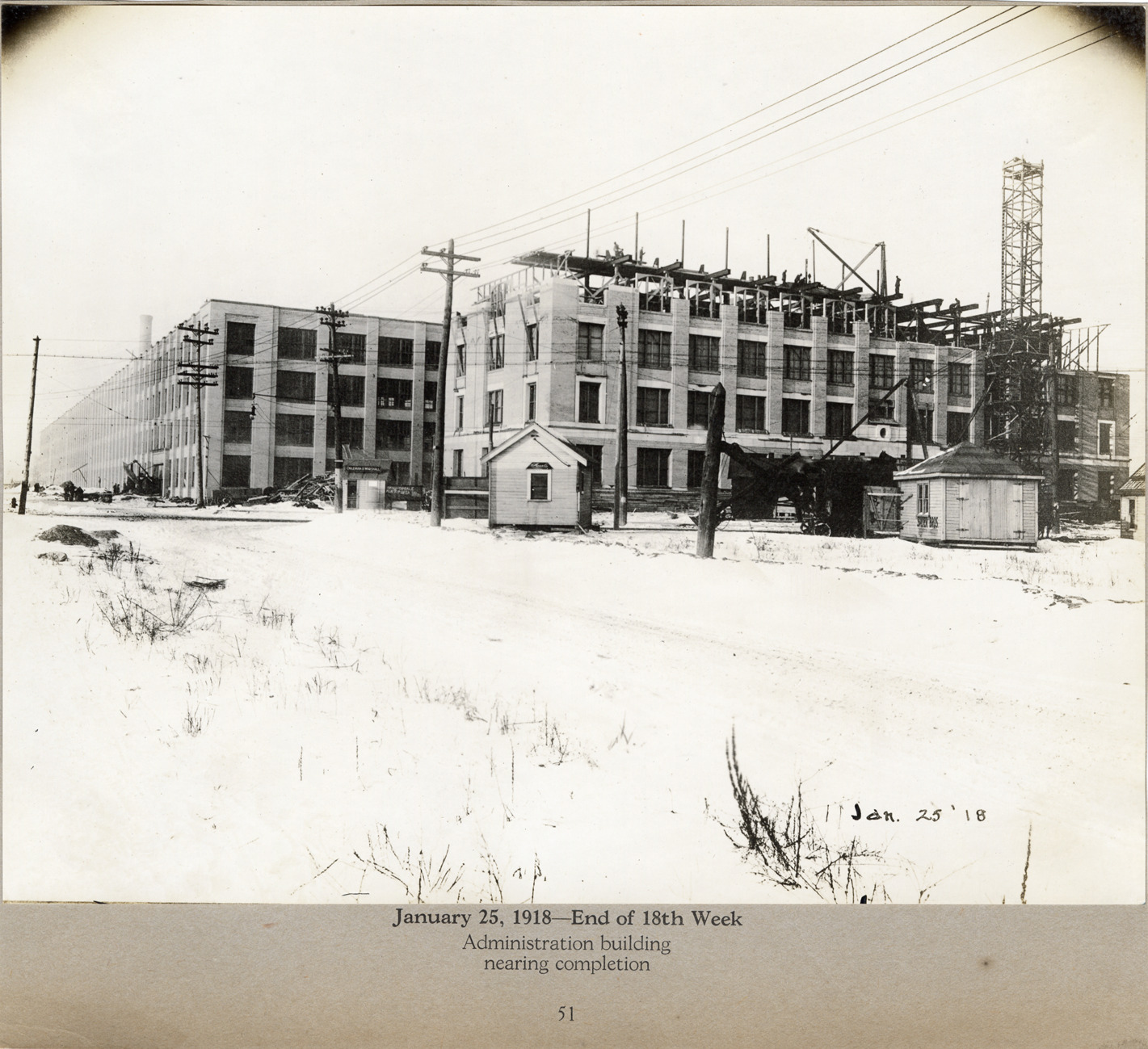View of the administration building during construction, Lincoln Motor Company factory. Printed on front: "Jan. 25 '18." Printed on mat: "January 25, 1918, end of 18th week. Administration building nearing completion. 51."
