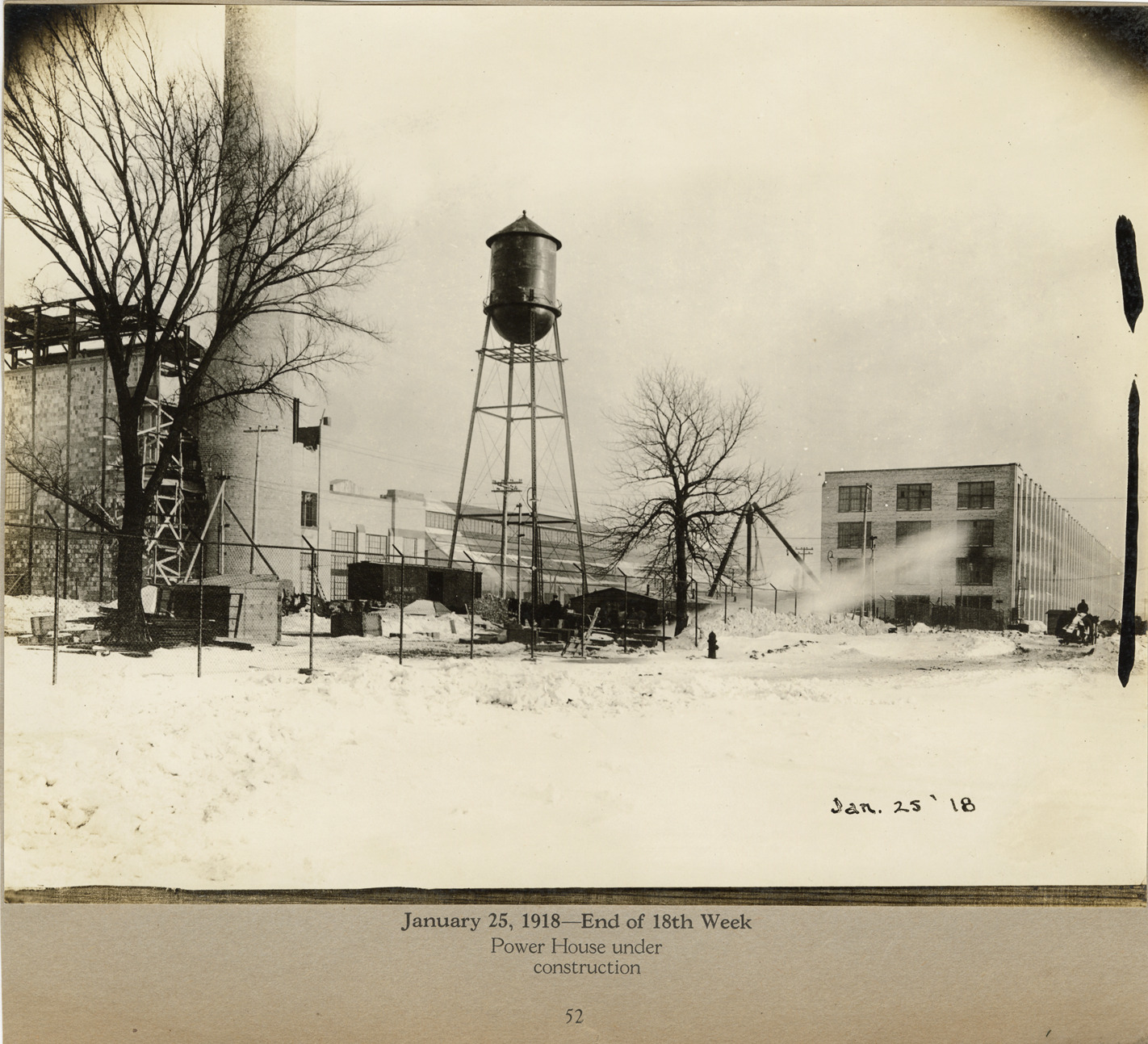 View of the power house during construction, Lincoln Motor Company factory. Water tower in background. Printed on front: "Jan. 25 '18." Printed on mat: "January 25, 1918, end of 18th week. Power house under construction. 52."