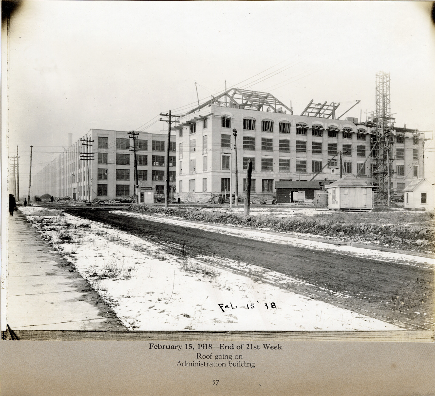 View of roof construction on the administration building, Lincoln Motor Company factory. Printed on front: "Feb. 15 '18. Holgate, 1554 Russell St., Detroit." Printed on mat: "February 15, 1918, end of 21st week. Roof going on administration building. 57."