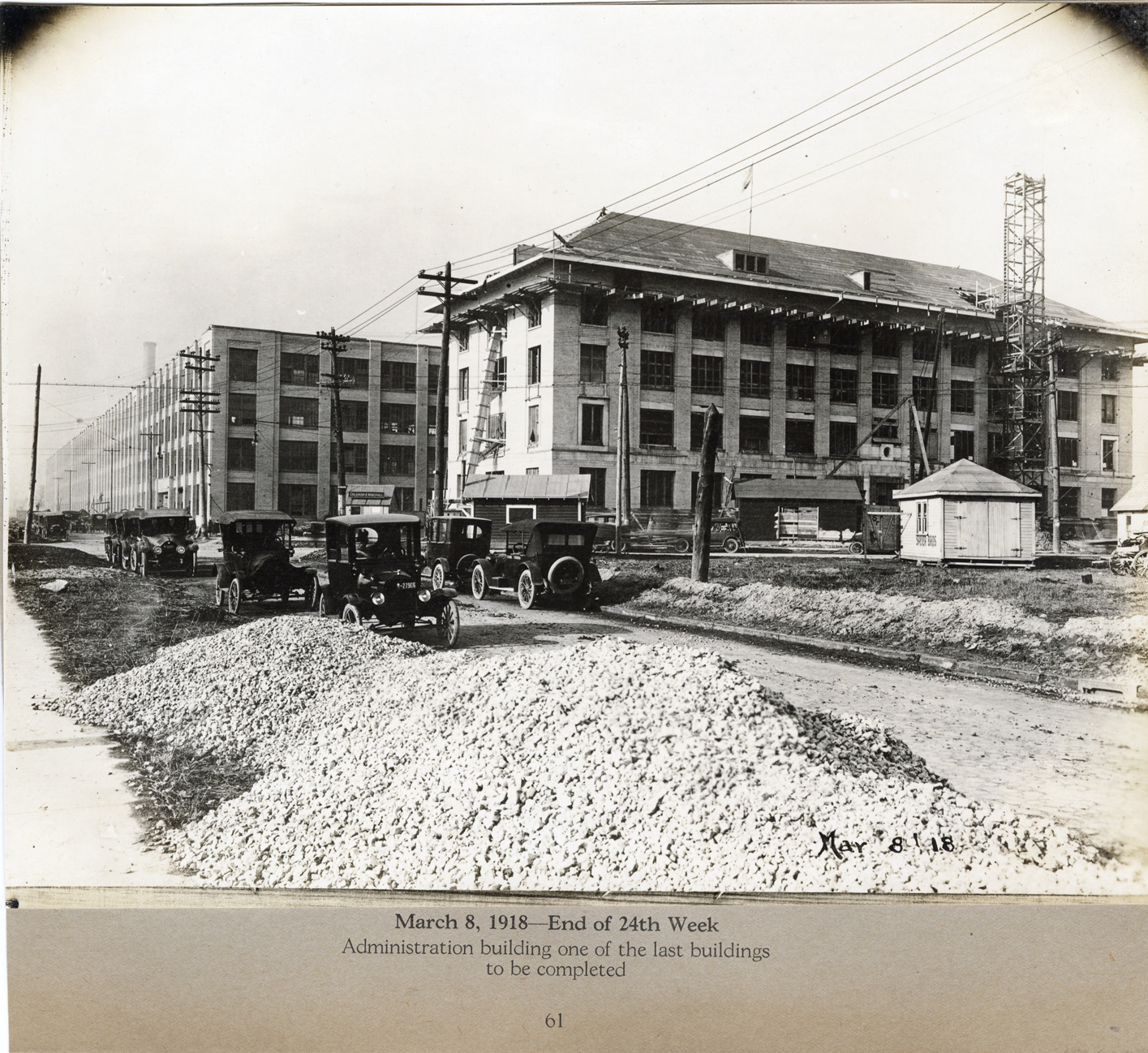 View of the administration building during construction, Lincoln Motor Company factory. Cars are parked near buildings. Printed on front: "Mar. 8 '18." Printed on mat: "March 8, 1918, end of 24th week. Administration building one of the last buildings to be completed. 61."