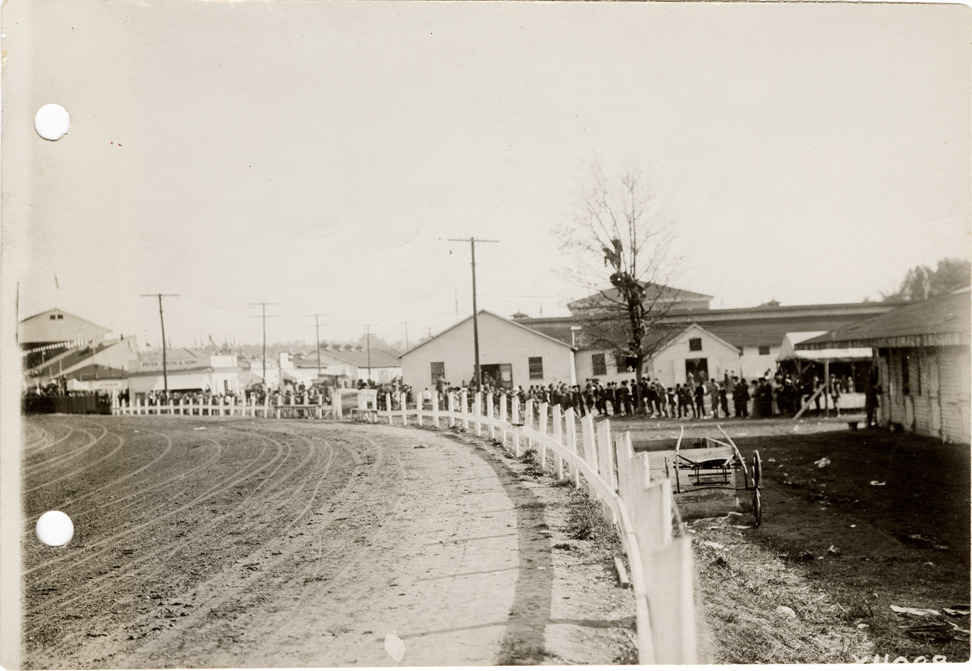 View of the racetrack at the Michigan State Fairgrounds. Spectators on sidelines and in tree; buildings in background. Stamped on back: "Spooner & Wells, Inc., photographers, 1231 Woodward Ave., Detroit, Mich., telephone North 1745." Handwritten on back: "Sam Butler's restriction kept the turn absolutely clear of people."