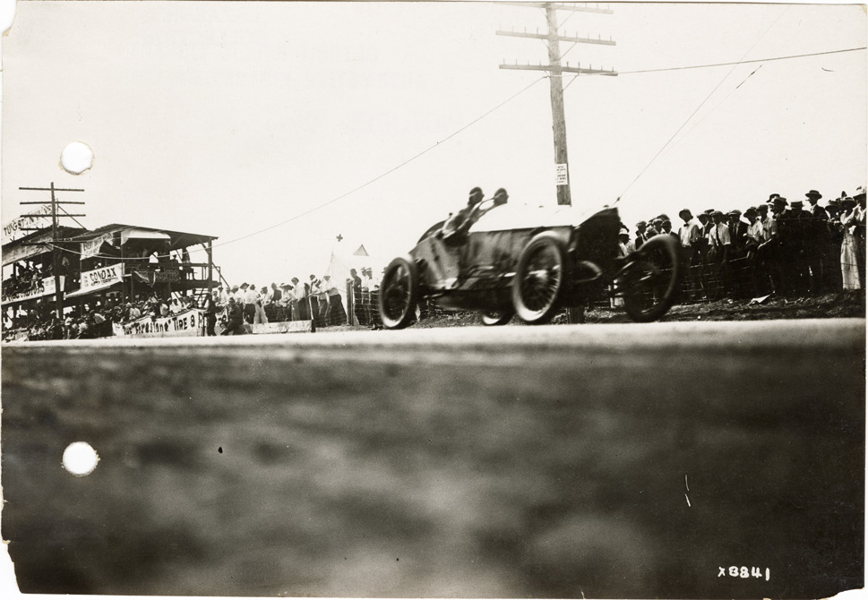 View of driver Ralph De Palma and passenger racing Mercedes car past spectators during the 1914 Elgin Races in Illinois. Handwritten on back: "Ralph De Palma in his last lap. Elgin Races, 1914."