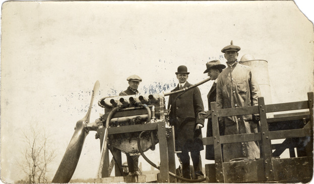 View of M.C. Kessler and Willett LaTourette posing with a Kessler aircraft engine. Handwritten on back: "M.C. Kessler with Derby hat & Willet LaTourrette [sic] in shop coat. Kessler 6 cyl. 200 h.p. engine, Detroit, Mich., 1917."