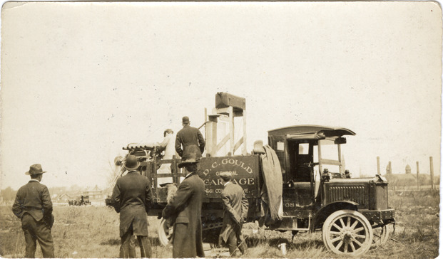 View of M.C. Kessler and other men testing a Kessler aircraft engine on truck near Waterworks Park. Handwritten on back: "First aviation 6 cyl. 200 h.p. engine built for U.S. Army in 1917 by Kessler Motor Car Co. being tested in vacant lot near Water Work [sic] Park, Detroit, Mich."