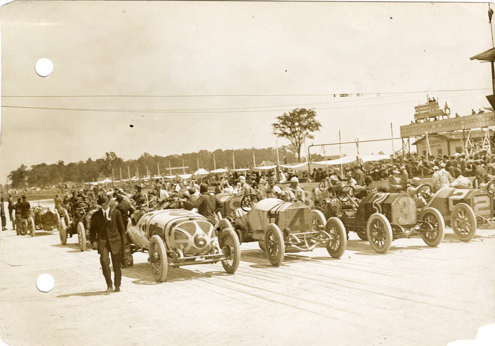 View of Stutz car no. 2, Fiat car no. 3, Mercedes car no. 4 and Case car no. 6 lined up at start during the 1912 Indianapolis 500 automobile races at the Indianapolis Speedway in Indiana. Stamped on back: "Spooner & Wells, Inc., photographers, 1231 Woodward Ave., Detroit, Mich., telephone North 1745." Handwritten on back: "Lineup for start, Ind. Race, May, 1912. 2, Zengle, Stutz. 3, Tetzlaff, Fiat. 4, DePalma, Mercedes. 6. Hearne, Case. Indianapolis, 1912."