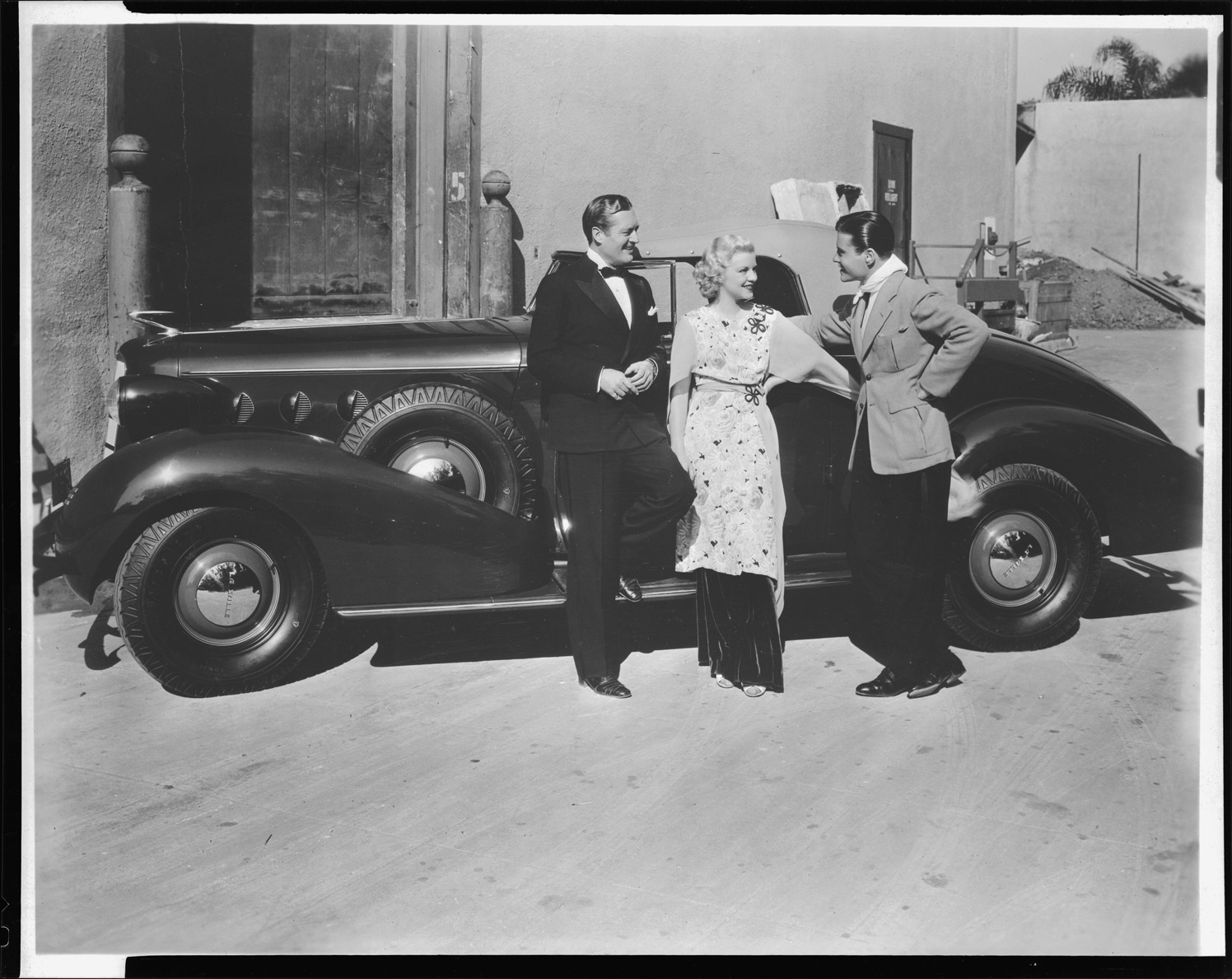 View of actors Claire Trevor, Edmund Lowe and Tom Brown posing with a 1934 LaSalle convertible coupe. Handwritten on sleeve: "LaSalle, '34. Con. coupe. Tom Brown, Claire Trevor, Edmund Lowe, still."
