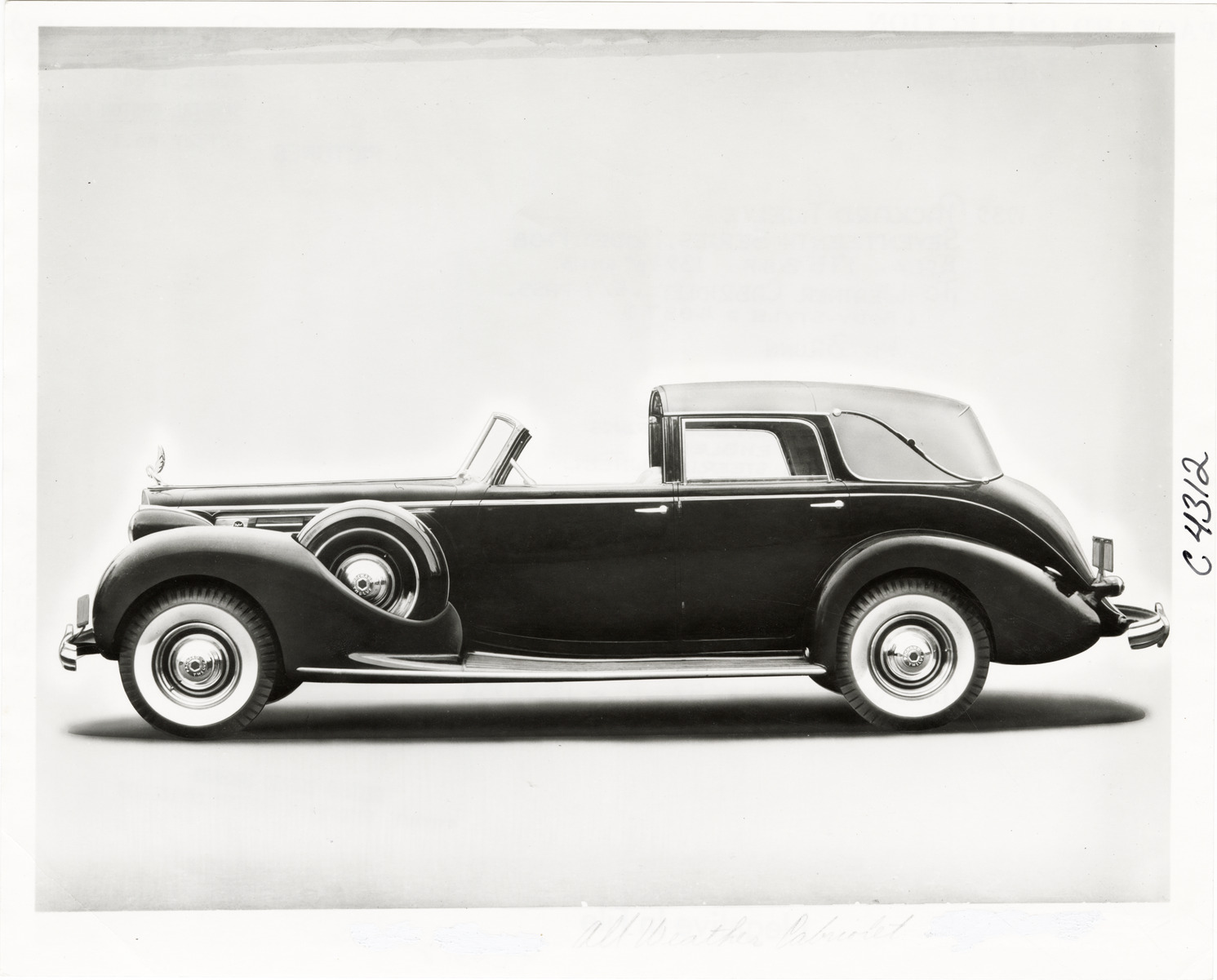 Favorite this☆ 1939 Packard Twelve automobile with Brunn body Description: View of a 1939 Packard Twelve car, Seventeenth Series, Model 1708 with Brunn body. Handwritten on back: "1939 Packard Twelve, Seventeenth Series, Model 1708. 12 cy., 175 b.h.p., 139 3/8" whb. All-weather cabriolet, 5/7-pass. Body-style #4087 by Brunn. Note: White sidewall tires; wheel trim beauty rings, pelican emblem, deluxe steering wheel." Details Resource ID: na050732 Subject: Packard automobile Brunn & Co. Photographic prints Date Issued: 1938-12-07 Format: 1 photographic print ; 8 x 10 in. Member of: National Automotive History Collection Filing Location: Packard, 1939, Seventeenth Series, Model 1708 Negative Number: 6529-C Rights: Physical rights are retained by DPL. Copyright is retained in accordance with U.S. copyright laws.