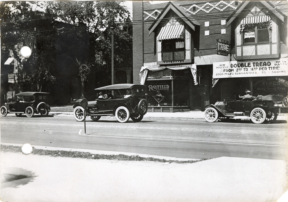 View of Hupmobiles in front of Tudor style commercial building on Woodward Avenue near Palmer. Stamped on back: "Spooner & Wells, Inc., photographers, 1231 Woodward Ave., Detroit, Mich." Handwritten on back: "Photo taken for the Hupp Motor Car Co. ca. 1915."