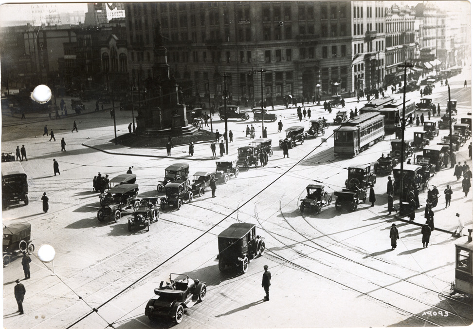 View of cars and streetcars at Campus Martius. Soldiers' and Sailors' Monument on left. Stamped on back: "Spooner & Wells, Inc., photographers, 1231 Woodward Ave., Detroit, Mich." Handwritten on back: "Photo taken for Speedway Country Club, ca. 1913-15."