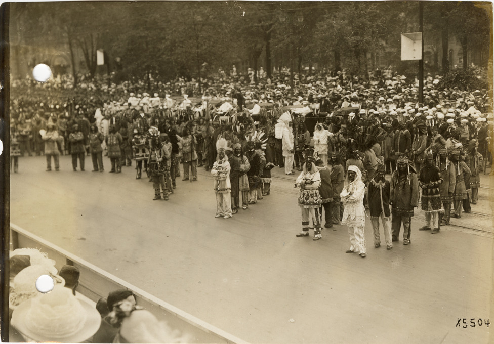 View of men wearing American Indian costume during the 1912 Cadillaqua celebration. Crowd in background. Stamped on back: "Spooner & Wells, Inc., photographers, 1231 Woodward Ave., Detroit, Mich., telephone North 1745." Handwritten on back: "Cadillaqua celebration, Detroit, 1912."