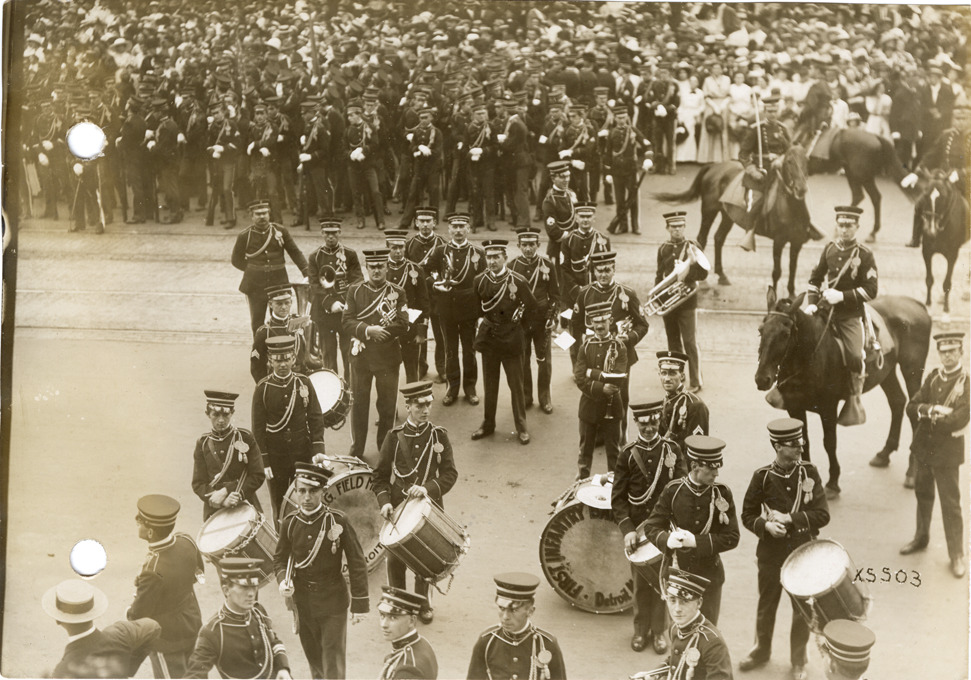 Favorite this☆ Marching band, 1912 Cadillaqua parade Description: View of a marching band at the 1912 Cadillaqua parade. Stamped on back: "Spooner & Wells, Inc., photographers, 1231 Woodward Ave., Detroit, Mich., telephone North 1745." Handwritten on back: "Cadillaqua celebration, Detroit, 1912." Details Resource ID: na050753 Creator: Spooner & Wells Subject: Marching bands--Michigan--Detroit Detroit (Mich.)--Anniversaries, etc. Photographers--Michigan--Detroit Photographic prints Date Issued: 1912-07 Format: 1 photographic print ; 4.5 x 6.5 in. Member of: National Automotive History Collection Lazarnick Collection Filing Location: Anniversaries-Cadillaqua, 1912, #1 Rights: Physical rights are retained by DPL. Copyright is retained in accordance with U.S. copyright laws.