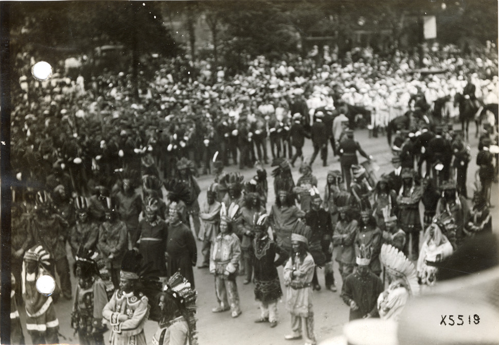 View of men wearing American Indian costume during the 1912 Cadillaqua celebration. Crowd in background. Stamped on back: "Spooner & Wells, Inc., photographers, 1231 Woodward Ave., Detroit, Mich., telephone North 1745." Handwritten on back: "Cadillaqua celebration, Detroit, 1912."