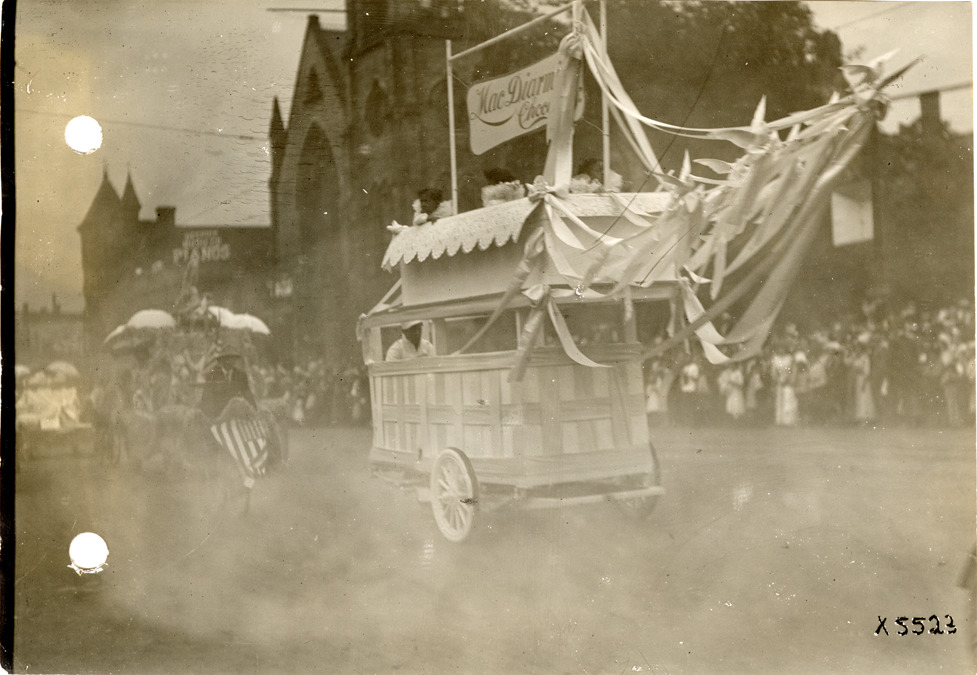 Favorite this☆ MacDiarmid's chocolates float, 1912 Cadillaqua parade Description: View of the MacDiarmid's chocolates float during the 1912 Cadillaqua parade. Stamped on back: "Spooner & Wells, Inc., photographers, 1231 Woodward Ave., Detroit, Mich., telephone North 1745." Handwritten on back: "Prize winner. Cadillaqua celebration, Detroit, 1912." Details Resource ID: na050765 Creator: Spooner & Wells Subject: Parade floats--Michigan--Detroit Detroit (Mich.)--Anniversaries, etc. Photographers--Michigan--Detroit Photographic prints Date Issued: 1912-07 Format: 1 photographic print ; 4.5 x 6.5 in. Member of: National Automotive History Collection Lazarnick Collection Filing Location: Anniversaries-Cadillaqua, 1912, #1 Rights: Physical rights are retained by DPL. Copyright is retained in accordance with U.S. copyright laws.