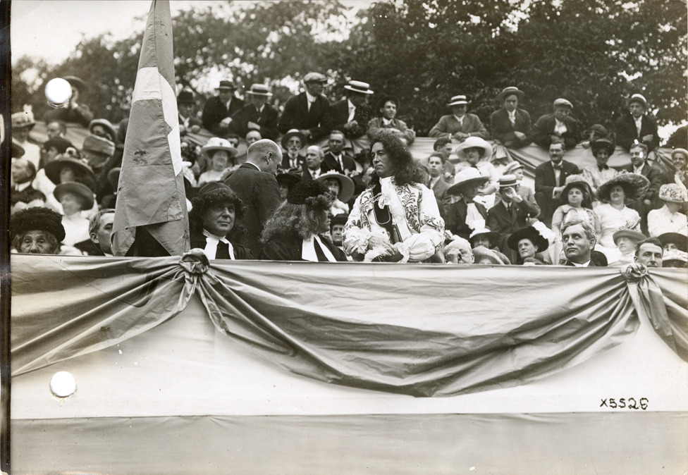 View of A.H. Green as Cadillac on reviewing stand with other dignitaries during the 1912 Cadillaqua celebration. Stamped on back: "Spooner & Wells, Inc., photographers, 1231 Woodward Ave., Detroit, Mich., telephone North 1745." Handwritten on back: "Cadillaqua celebration, Detroit, 1912."