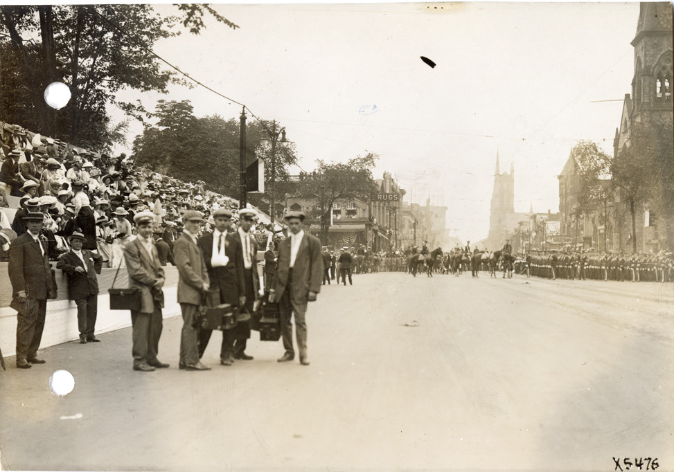View of the 1912 Cadillaqua parade. Men with cases in foreground, possibly journalists or photographers. Reviewing stand on left. Stamped on back: "Spooner & Wells, Inc., photographers, 1231 Woodward Ave., Detroit, Mich., telephone North 1745." Handwritten on back: "Cadillaqua celebration, Detroit, 1912."