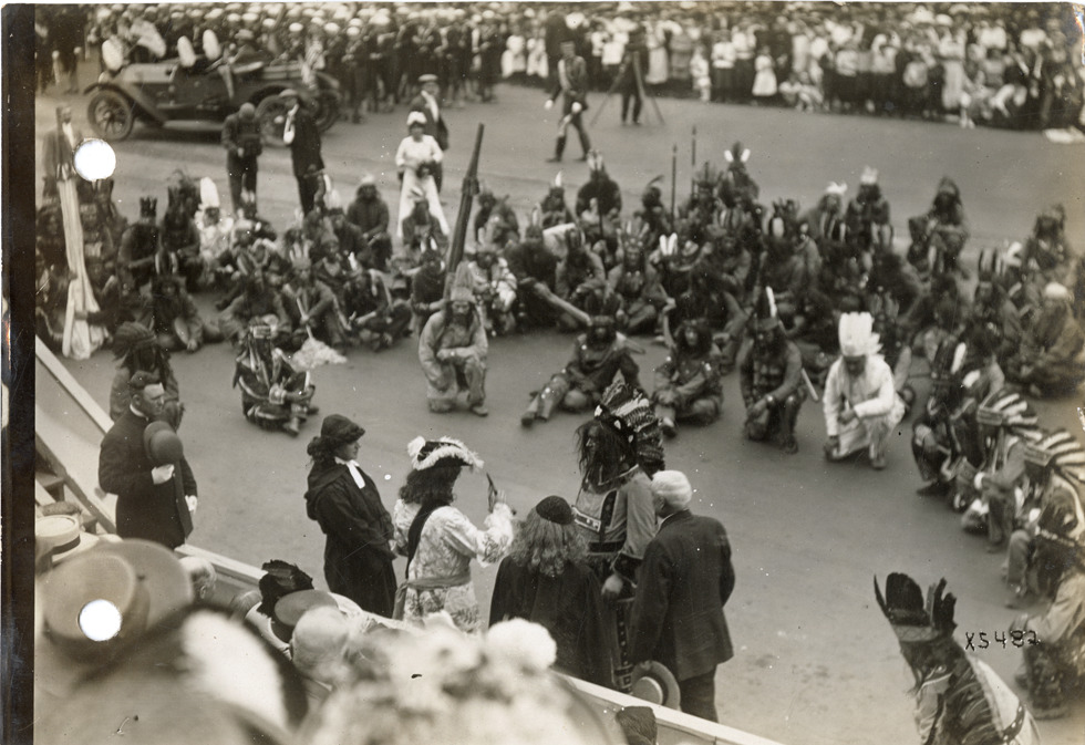 Favorite this☆ Cadillac landing reenactment, 1912 Cadillaqua Description: View of A.H. Green as Cadillac and men dressed as American Indians reenacting Cadillac's landing in Detroit during the 1912 Cadillaqua celebration. Crowd in background. Handwritten on back: "Cadillaqua celebration, Detroit, Mich., 1912." Details Resource ID: na050787 Subject: Cadillac, Antoine Laumet de Lamothe, 1658-1730 Indians of North America--Clothing Detroit (Mich.)--Anniversaries, etc. Photographic prints Date Issued: 1912-07 Format: 1 photographic print ; 4.5 x 6.5 in. Member of: National Automotive History Collection Lazarnick Collection Filing Location: Anniversaries-Cadillaqua, 1912, #2 Rights: Physical rights are retained by DPL. Copyright is retained in accordance with U.S. copyright laws.
