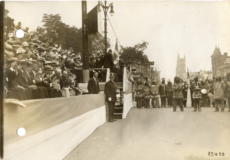 View of men wearing American Indian costume in front of reviewing stand during the 1912 Cadillaqua celebration. Crowd in background. Stamped on back: "Spooner & Wells, Inc., photographers, 1231 Woodward Ave., Detroit, Mich., telephone North 1745." Handwritten on back: "Cadillaqua celebration, Detroit, 1912."