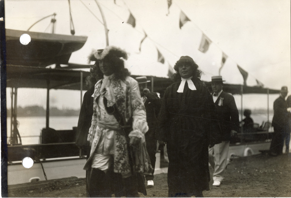A.H. Green as Cadillac walking away from boat, 1912 Cadillaqua water fete